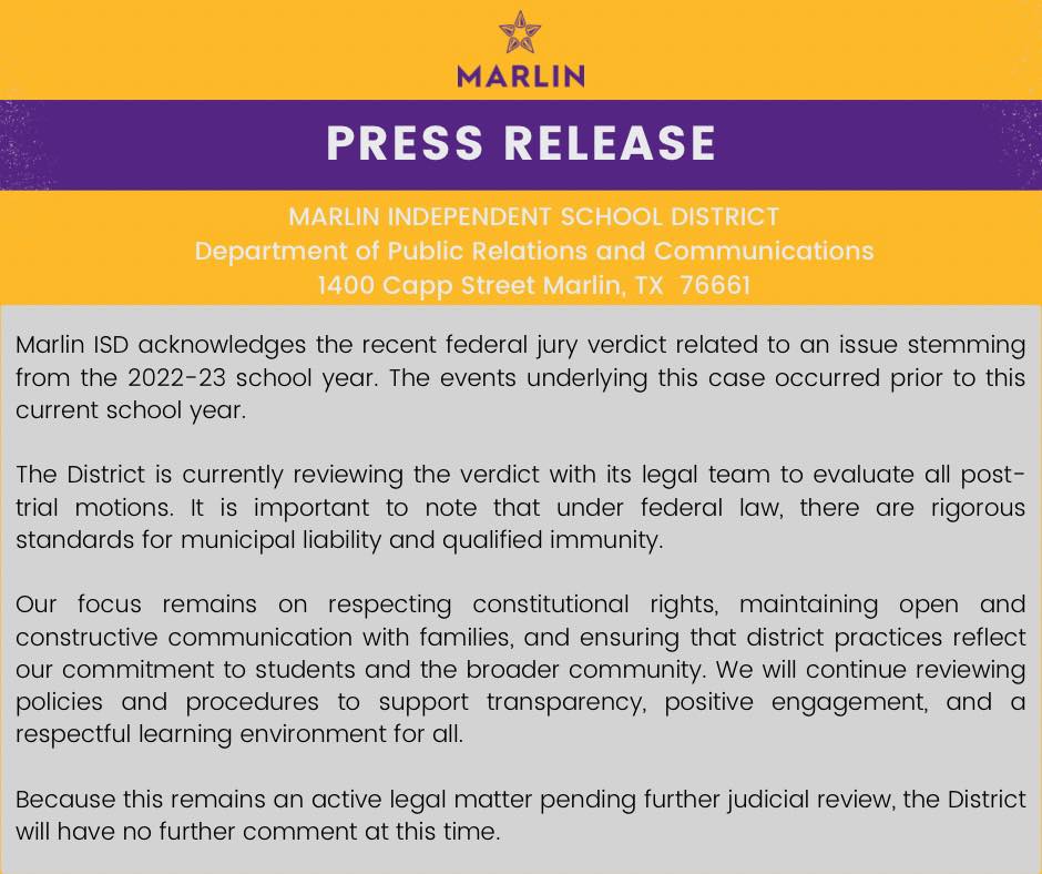 A statement released Thursday by Marlin ISD noted that the events underlying the case “occurred prior to this current school year” and that federal law includes “rigorous standards” for qualified immunity. The district is now “reviewing the verdict with its legal team to evaluate all post-trial motions.”