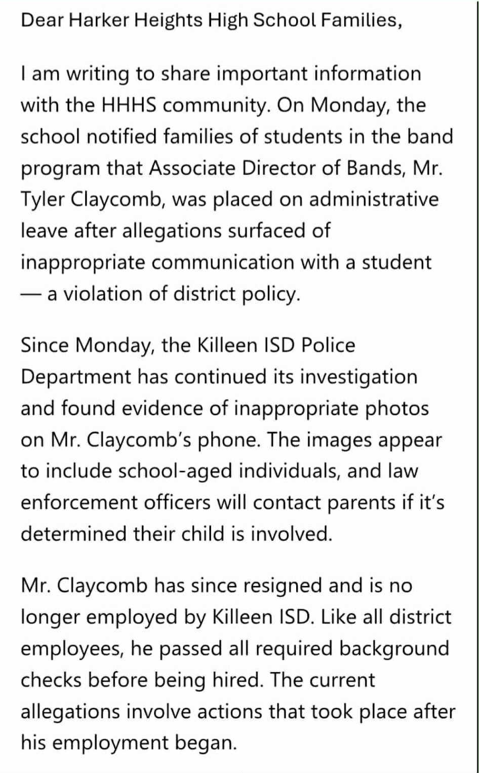 Mr. Claycomb has since resigned and is no longer employed by Killeen ISD. Like all district employees, he passed all required background checks before being hired. The current allegations involve actions that took place after his employment began.