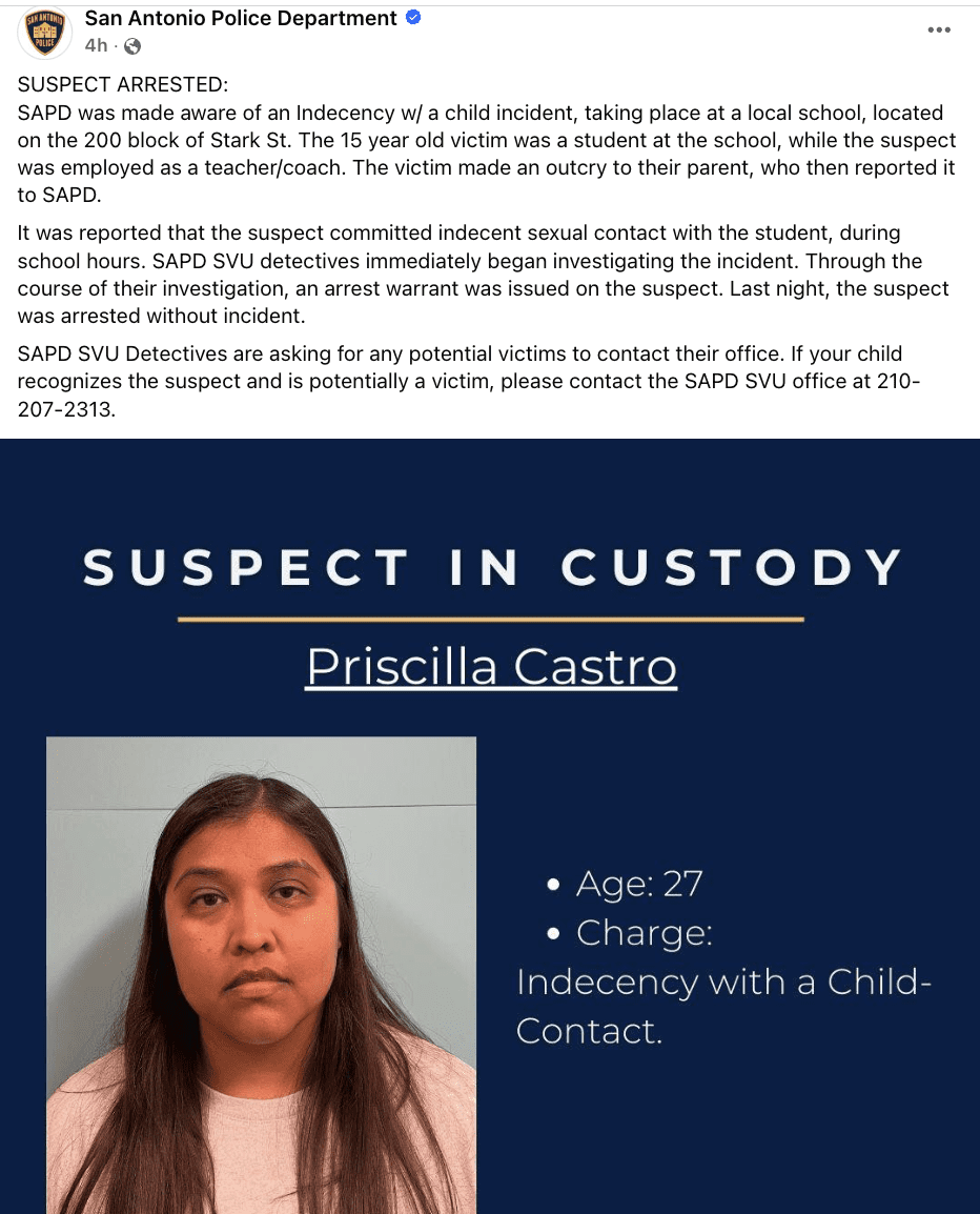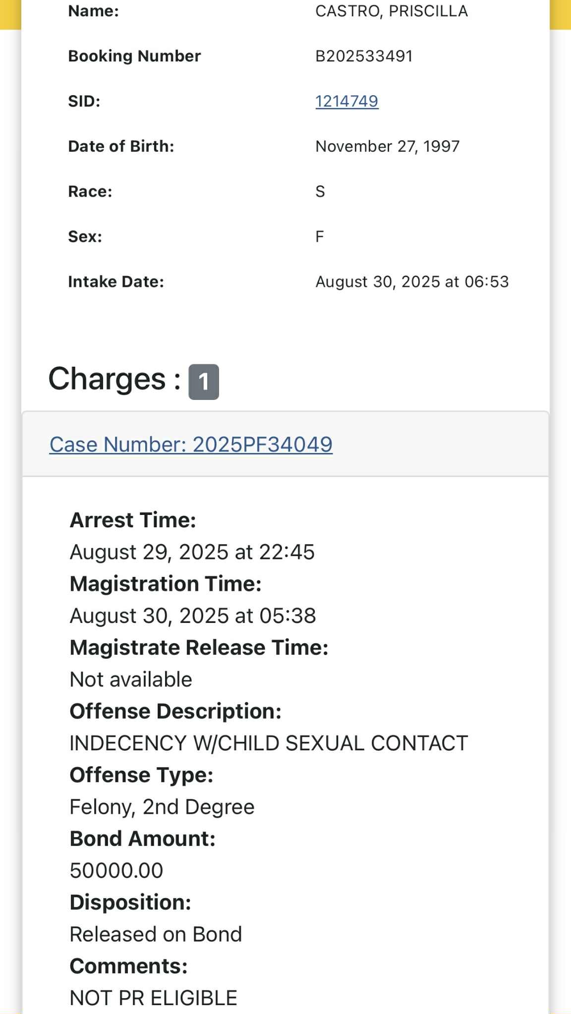 Priscilla Castro, 27, was arrested Friday night on a charge of indecency with a child by sexual contact, a second-degree felony punishable by 2 to 20 years in prison.