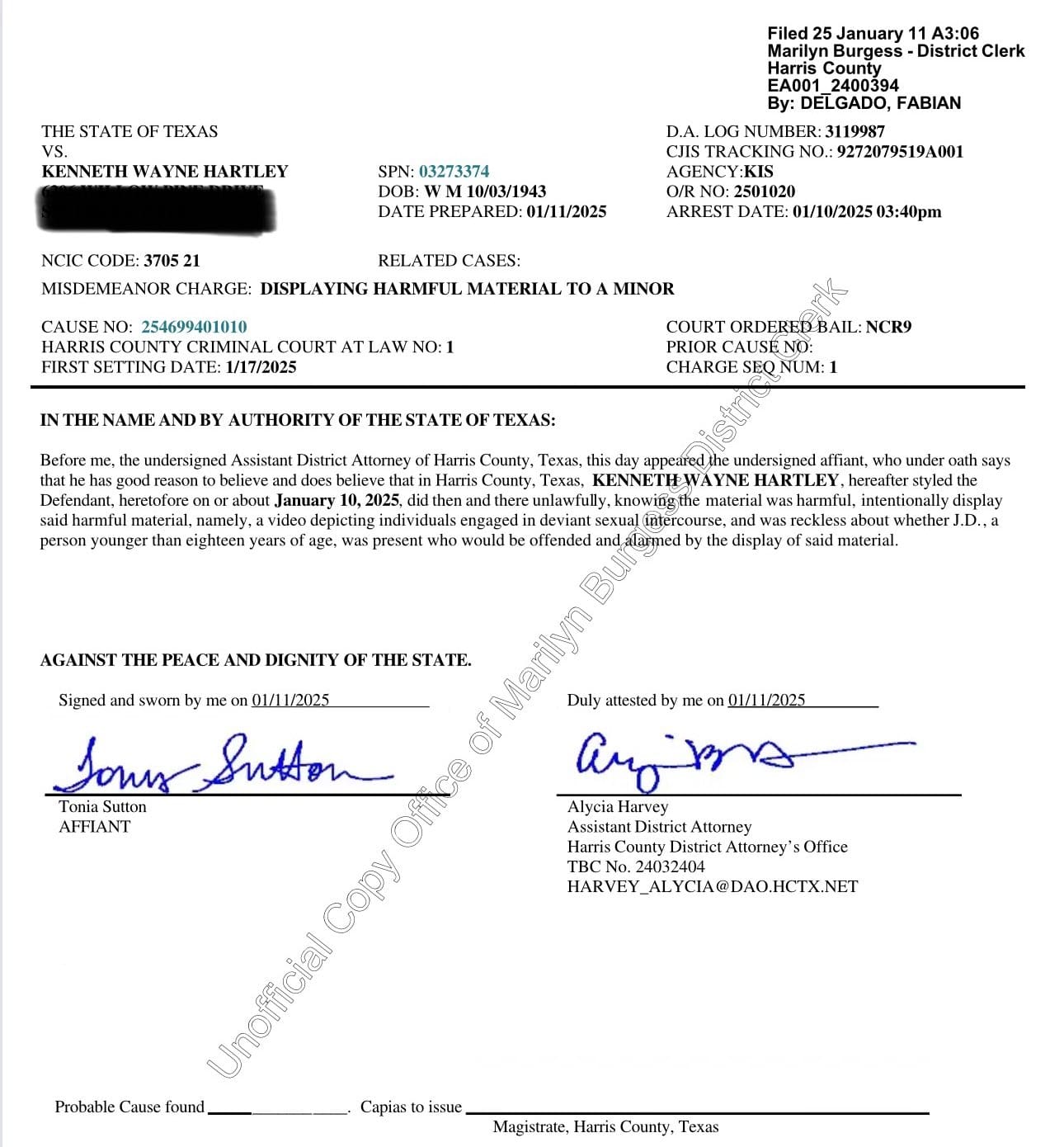 The Harris County District Attorney’s Office requested bond conditions prohibiting Hartley from contacting anyone under the age of 18. However, the presiding judge denied this request. Hartley has since posted his $100 bond.