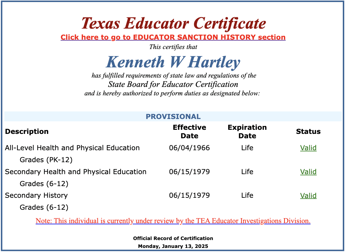 Hartley holds lifetime teaching certifications issued by the state in 1966 and 1979. His certification status is currently under review by the Texas Education Agency.