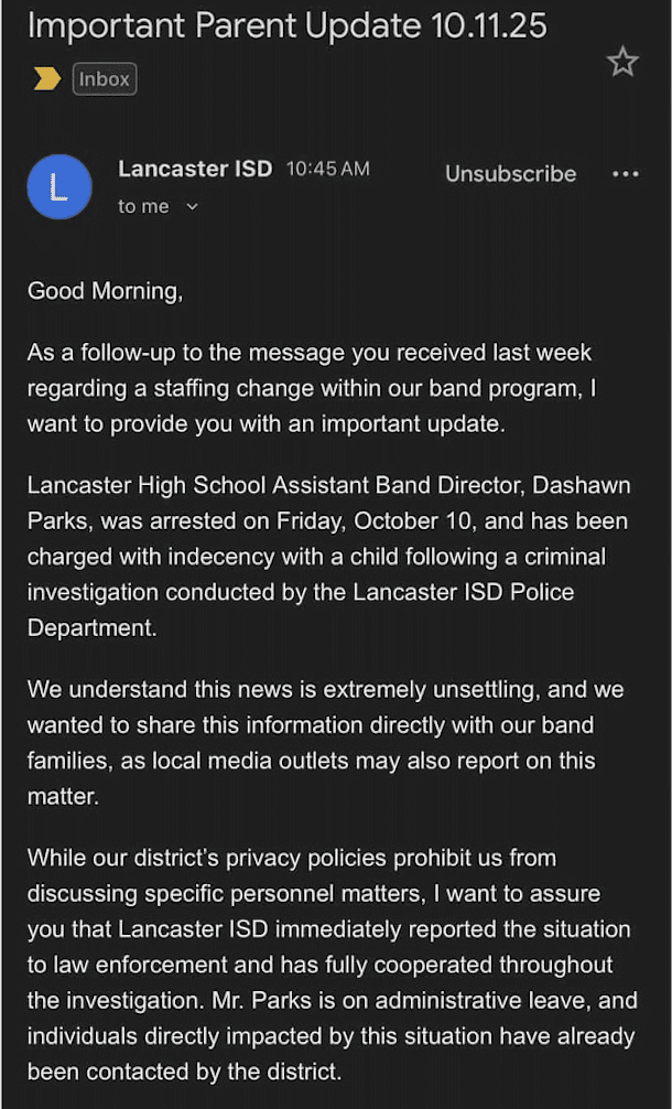According to a district statement sent to band families on October 11, Parks’ arrest followed a criminal investigation conducted by the Lancaster ISD Police Department.