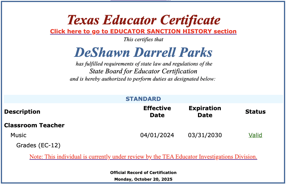 State records show Parks has been certified to teach music since 2013. His current teaching certificate is under review by the Texas Education Agency.