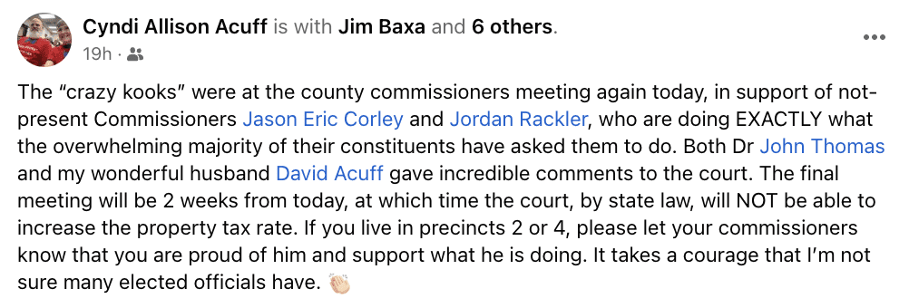 Acuff urged Lubbock County residents who support Corley and Rackler to contact their commissioners. “It takes a courage that I’m not sure many elected officials have.”