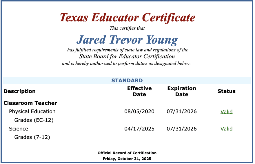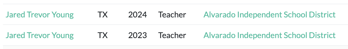 Young has held a Texas teaching certificate since 2020. Online records show he previously taught in Alvarado ISD.