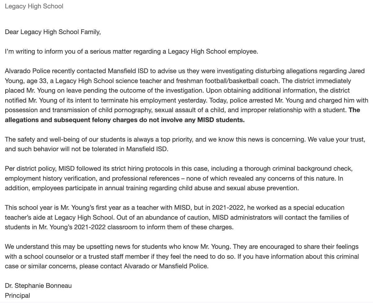 Legacy High School Principal Stephanie Bonneau notified families Thursday of Young’s arrest following an investigation by the Alvarado Police Department.