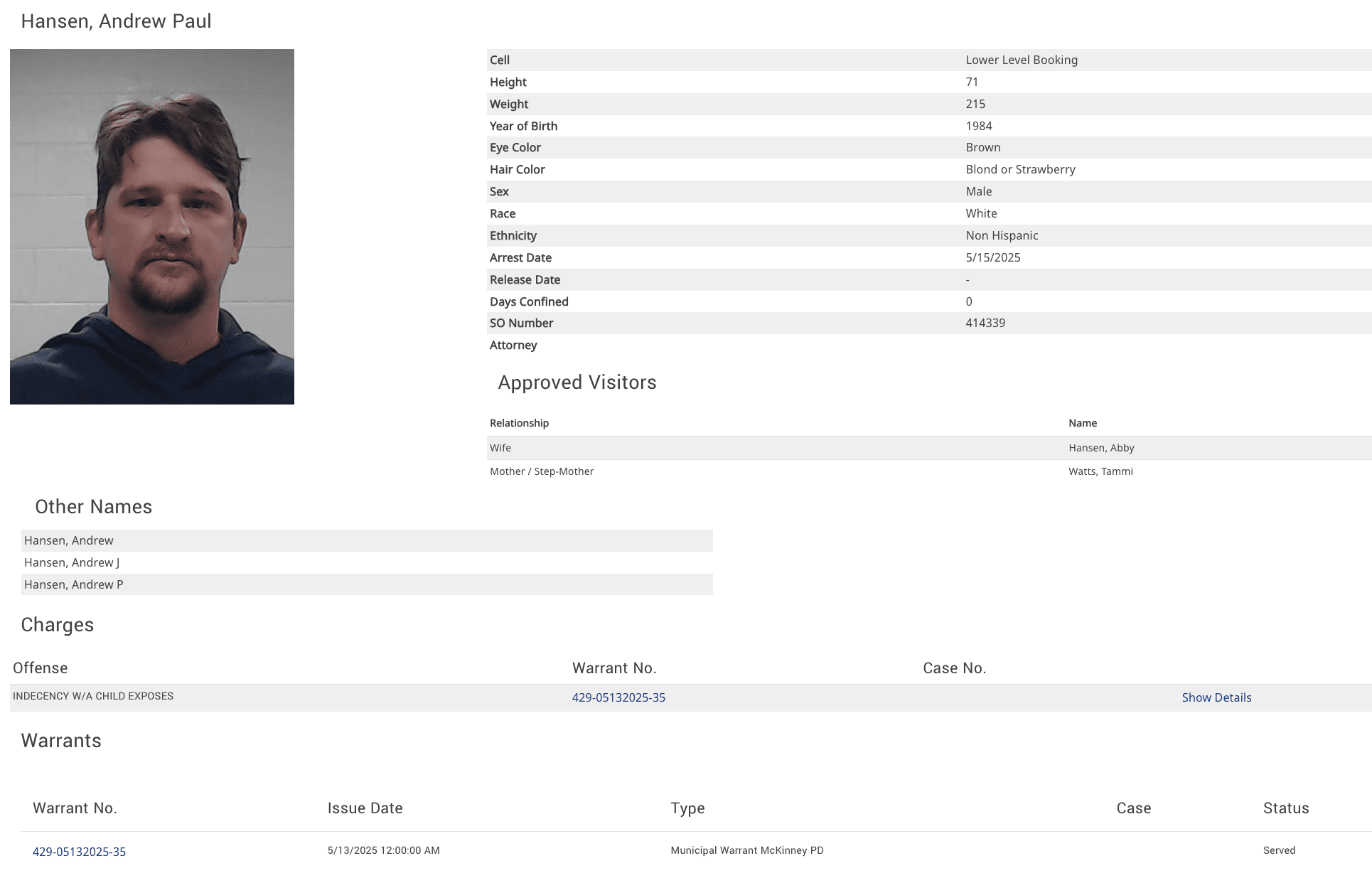 Hansen was booked into the Collin County Jail on May 15 and released the next day on a $50,000 bond.