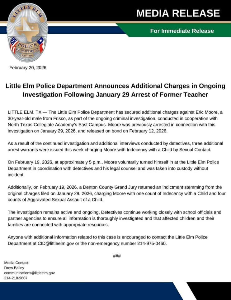 At the time of his initial arrest, Moore was a teacher at the North Texas Collegiate Academy’s East Campus in Little Elm, a charter school that serves pre-K through 8th grade students.