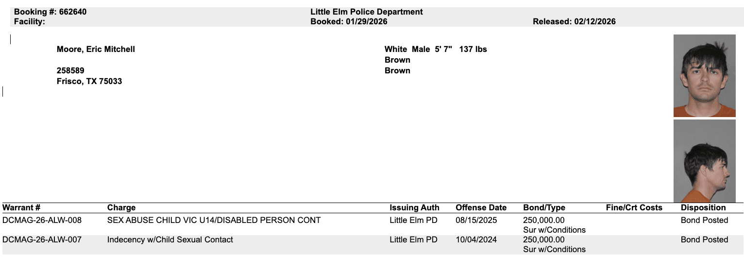 Eric Mitchell Moore, 30, was taken into custody on three new charges of indecency with a child by sexual contact, according to the Little Elm Police Department.