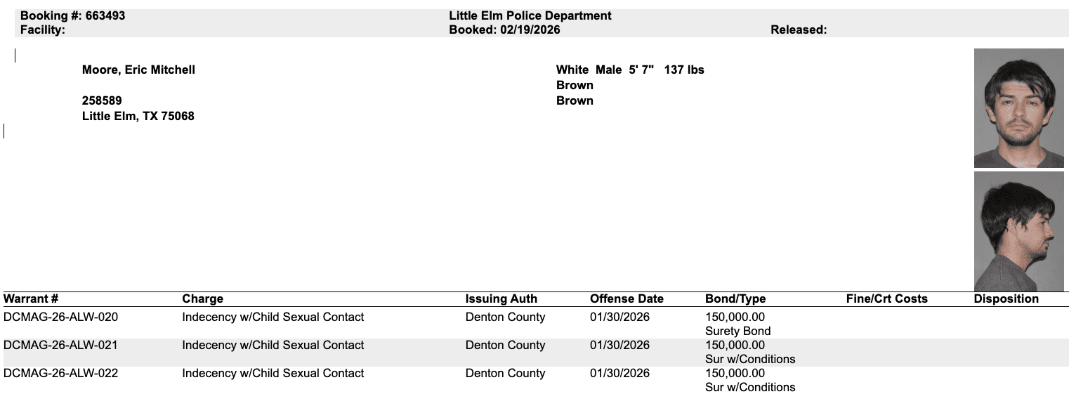 Moore was booked into the Denton County Jail again on February 19. Total bonds are set at $450,000—$150,000 for each charge.