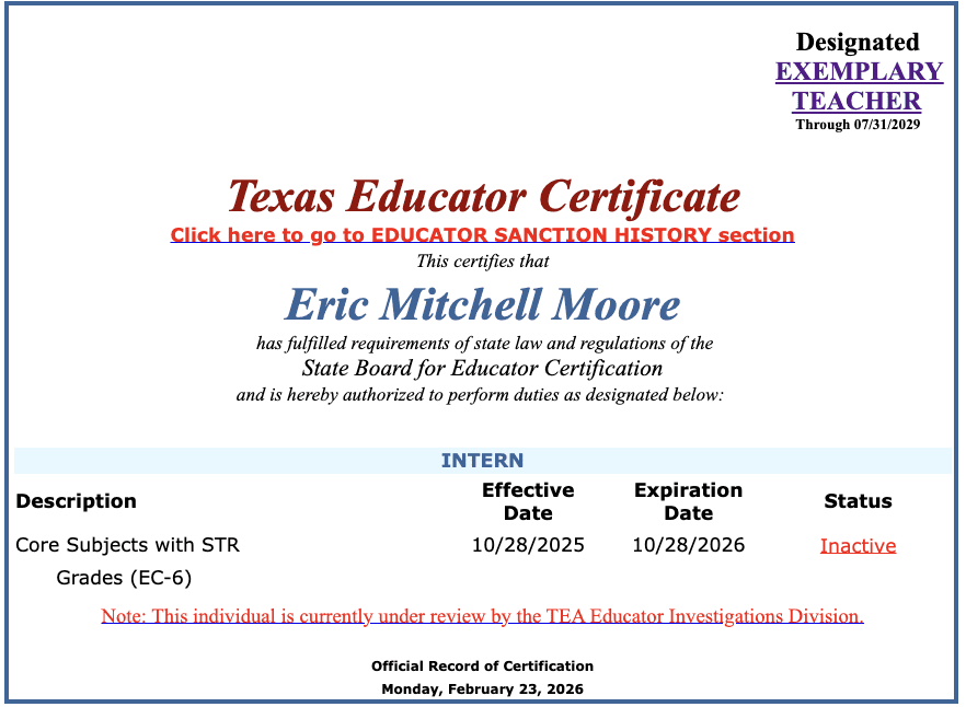 Moore received an intern teaching certificate in October 2025, which is currently “inactive” and under investigation by the Texas Education Agency.