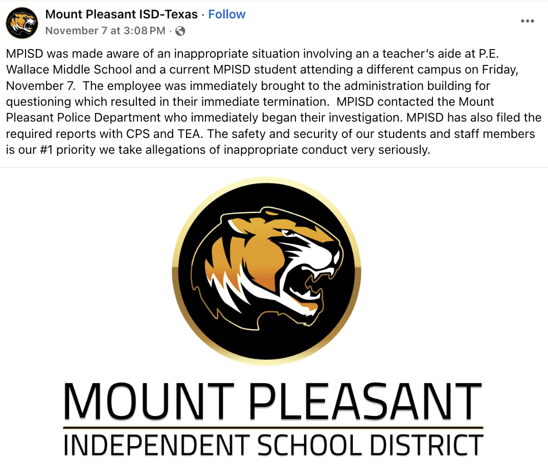 Mount Pleasant ISD stated it has also filed required reports with Child Protective Services and the Texas Education Agency.