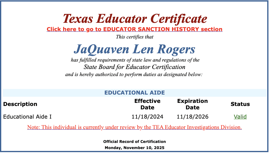 Rogers received an educational aide certificate in November 2024, which is now under review by the TEA.