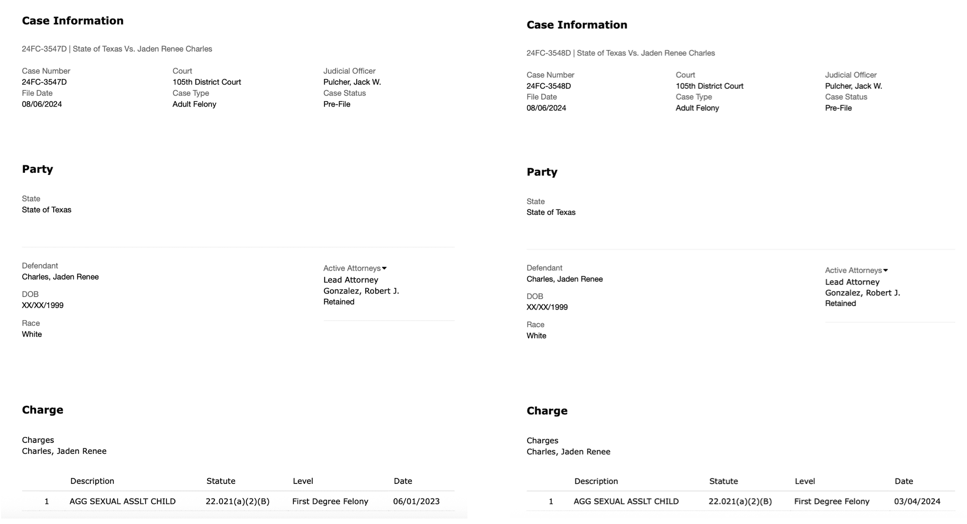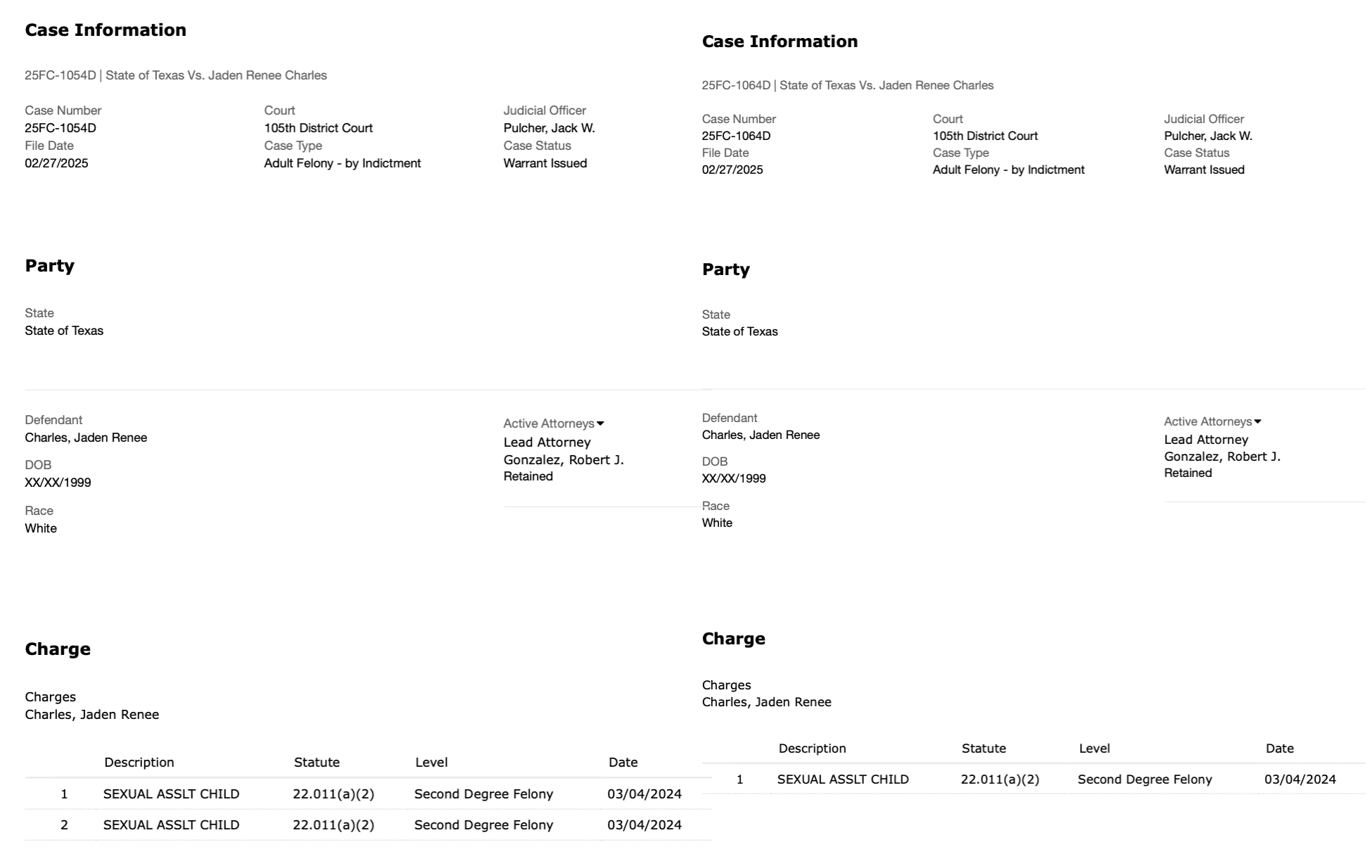 More recent court records show Charles facing three counts of sexual assault of a child, a second-degree felony.