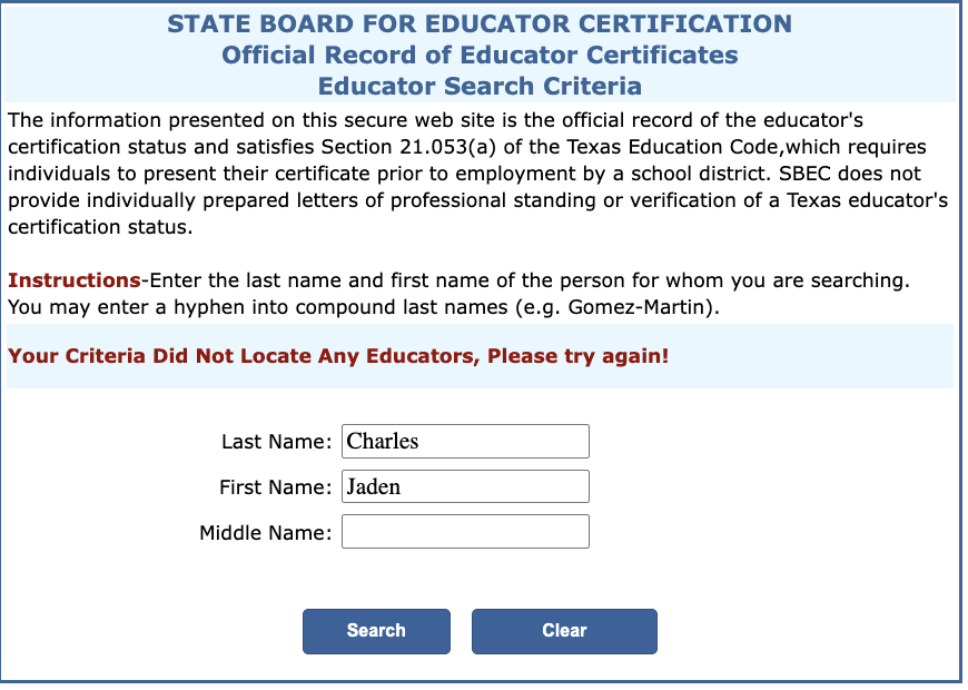 Charles does not hold a Texas teaching certificate. She is listed as “under investigation” on the state’s Do Not Hire Registry.