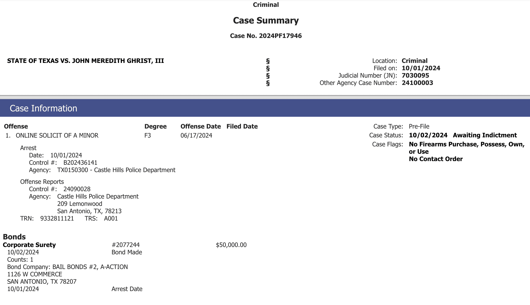 Ghrist was booked into the Bexar County Jail on October 2 and released on a $50,000 bond.