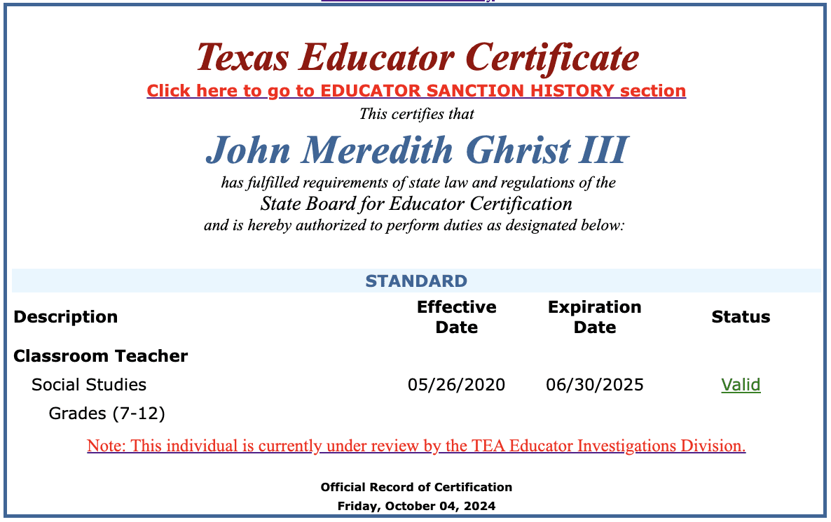 State records show Ghrist was certified to teach social studies in 2020. His teaching certificate remains valid but shows he is under review by the Texas Education Agency’s Educator Investigations Division.