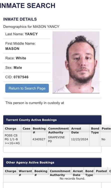 Yancy was arrested on December 23 by the Grapevine Police Department and charged with possession of a controlled substance, then transferred to the Tarrant County Jail on December 24.