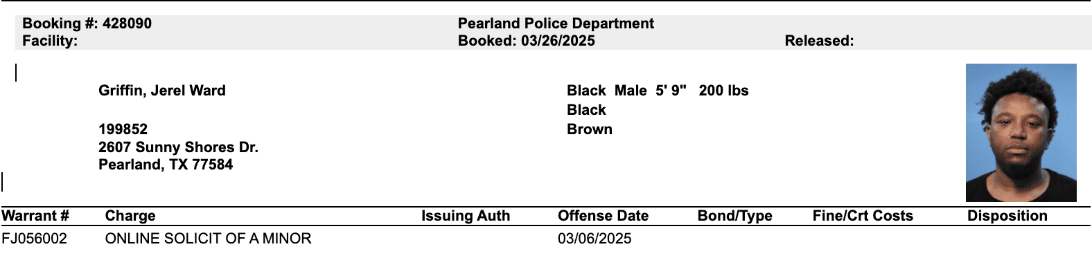 The Pearland Police Department arrested Griffin on March 26. He was booked into the Brazoria County Jail later that day.
