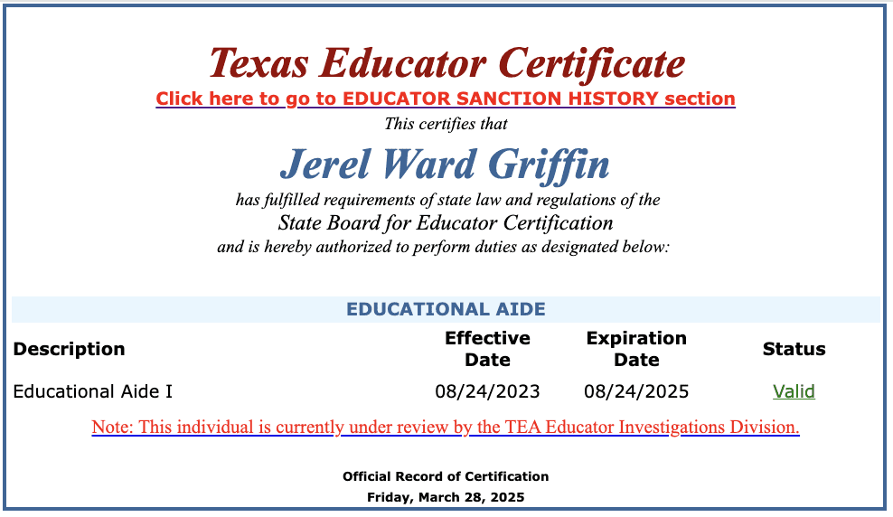 State records show that Griffin’s teaching certificate is under review by the Texas Education Agency.