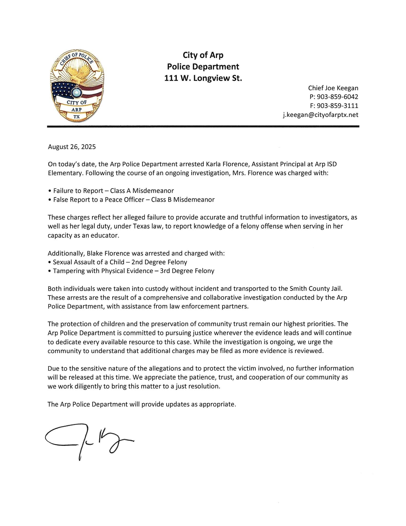 “The protection of children and the preservation of community trust remain our highest priorities,” stated APD Chief Joe Keegan. “The Arp Police Department is committed to pursuing justice wherever the evidence leads and will continue to dedicate every available resource to this case.”