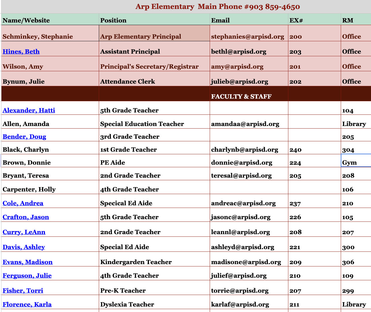 Karla Florence is no longer listed as the Arp Elementary assistant principal but is still shown in the staff roster as a dyslexia teacher.