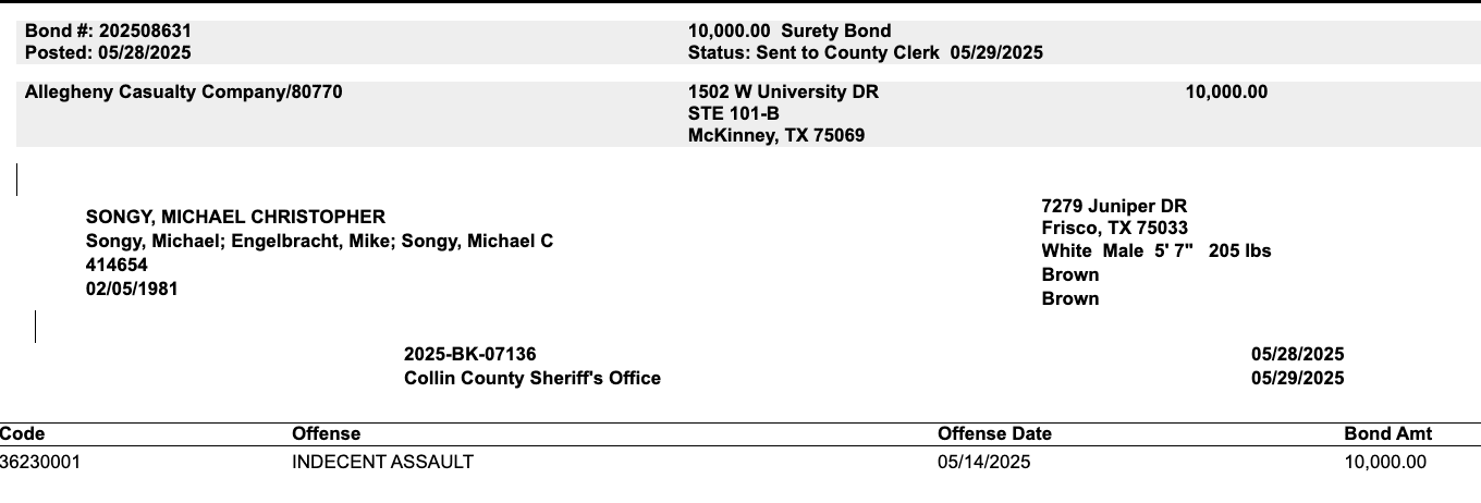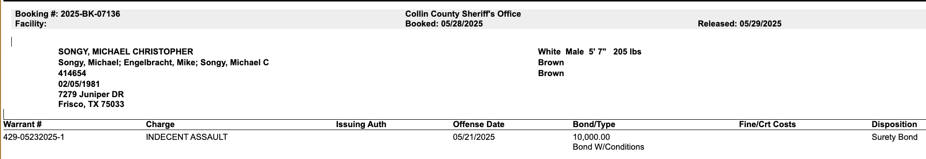 Songy was booked into the Collin County Jail on May 28 and released the next day on a $10,000 bond.