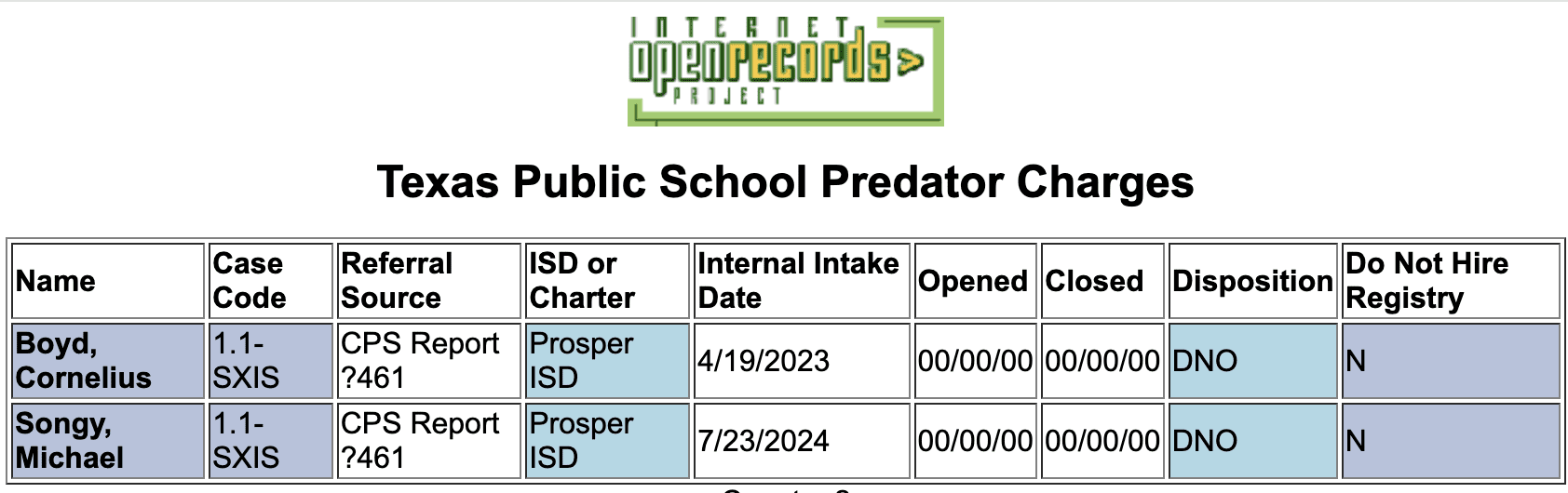 State records show Songy was reported to the Texas Education Agency in July 2024 for sexual misconduct in school—which includes sexual assault, continuous sex abuse of young child, and indecency with a child—but the TEA did not open a formal investigation.