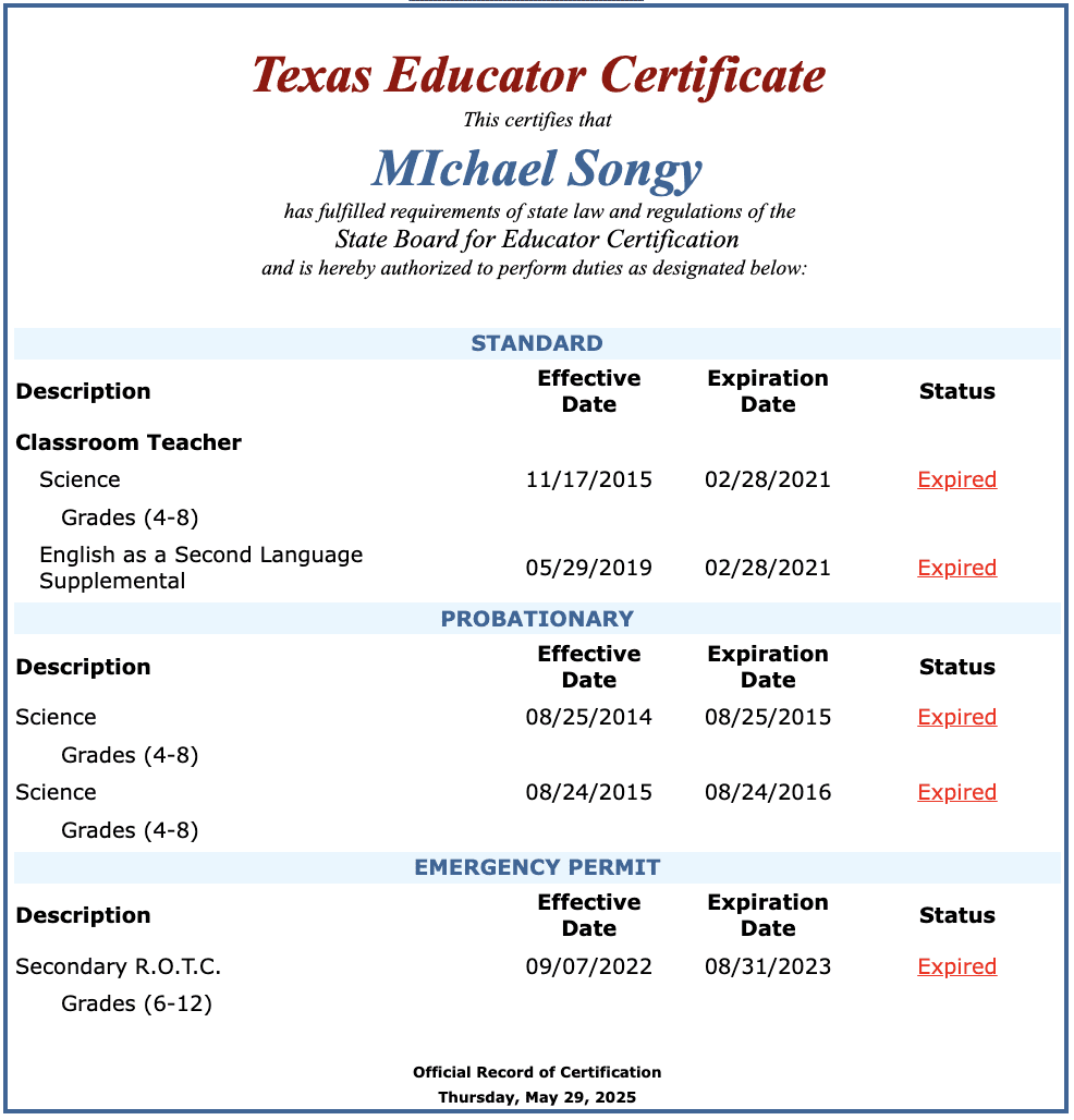 He has held a Texas teaching certificate since 2015. Songy received an emergency permit in August 2024 to teach Junior ROTC.