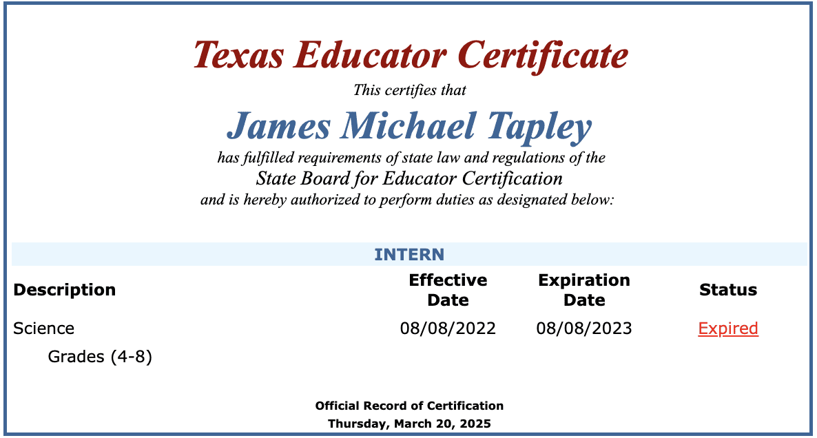 State records show Tapley was issued a one-year intern teaching certificate in August 2022, which has since expired.