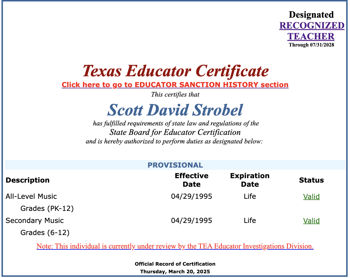 State records show Strobel was issued a lifetime teaching certificate for music in 1995. His certificate indicates Strobel is designated as a “recognized teacher”—a “distinction awarded to highly effective public school teachers,” according to the Texas Education Agency.