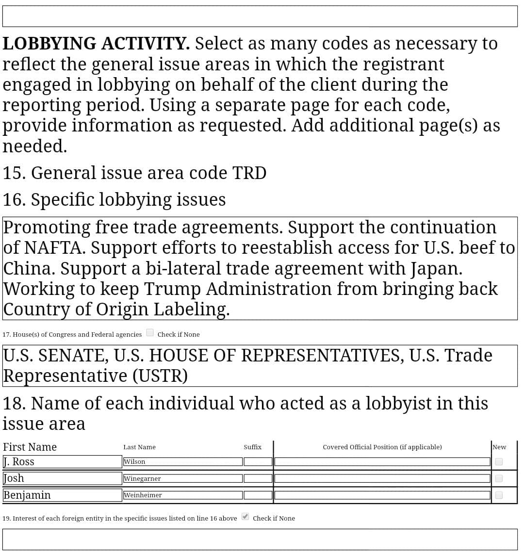 According to a 2017 second-quarter lobbying disclosure filing, 13th District Republican candidate Josh Winegarner was listed as having lobbied on behalf of the Texas Cattle Feeders Association to “support the continuation of NAFTA” and “to keep Trump administration from bringing back country-of-origin labeling.”