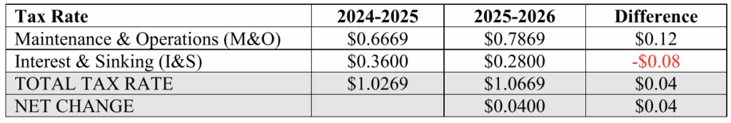 The proposed 4-cent rate increase includes an additional 12 cents in the Maintenance and Operations (M&O) rate, used to pay for operating expenses, and an 8-cent drop in the Interest and Sinking (I&S) rate, used to repay debt.