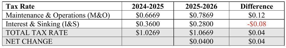 The proposed 4-cent rate increase includes an additional 12 cents in the Maintenance and Operations (M&O) rate, used to pay for operating expenses, and an 8-cent drop in the Interest and Sinking (I&S) rate, used to repay debt.