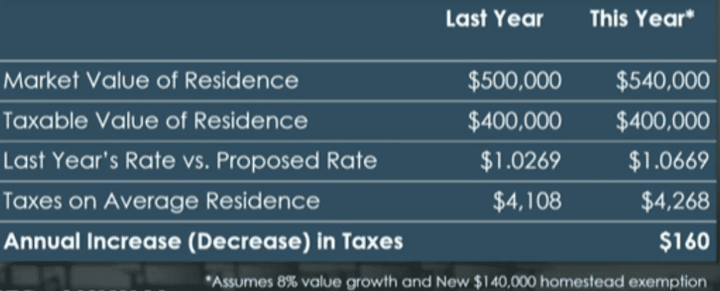 That 3.9-percent tax bill hike assumes an 8-percent increase in property values, raising the average home value from $500,000 to $540,000. It also assumes voters statewide approve a November ballot measure to increase the homestead exemption by $40,000 to $140,000—essentially offsetting the rise in appraised values.