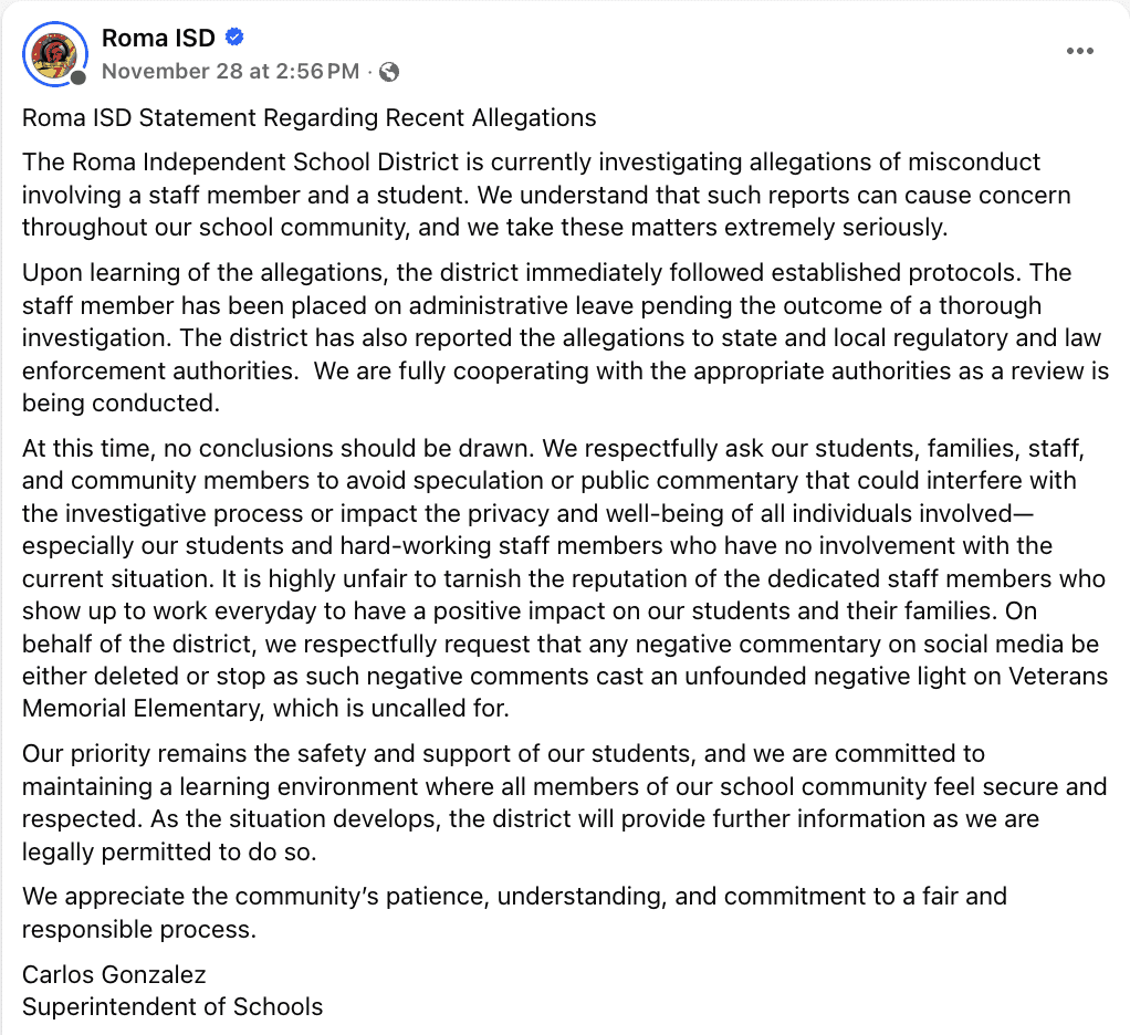 Roma Independent School District Superintendent Carlos Gonzalez posted on Facebook Friday that an unnamed staff member had been placed on administrative leave pending the outcome of an investigation.