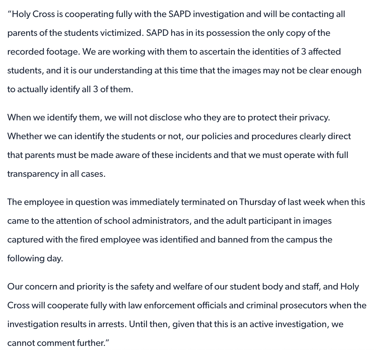 On Monday, an attorney for Holy Cross told KSAT that SAPD has the only copy of the footage and that the school is working with police to identify three students who were victimized.