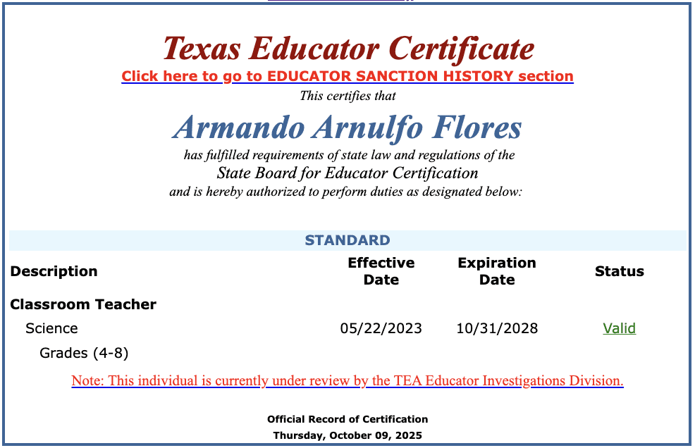 State records show Flores holds a Texas teaching certificate, which is currently under review by the Texas Education Agency.