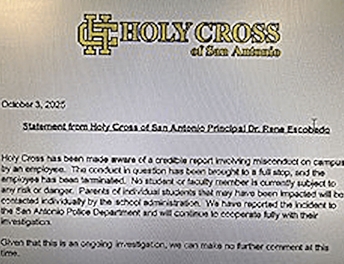 Holy Cross Principal Rene Escobedo issued a statement on October 3 indicating that an unnamed employee was fired following a “credible report” of misconduct on campus.