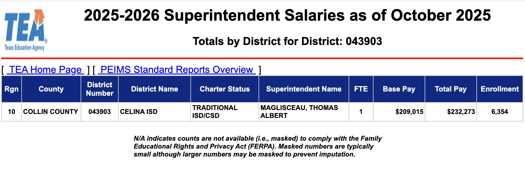 Celina ISD has not yet responded to a request for copies of Superintendent Maglisceau’s current contract or the district’s separation agreement with Bill Elliott. According to the most recent data published by the Texas Education Agency, Maglisceau’s current base salary is $209,000.