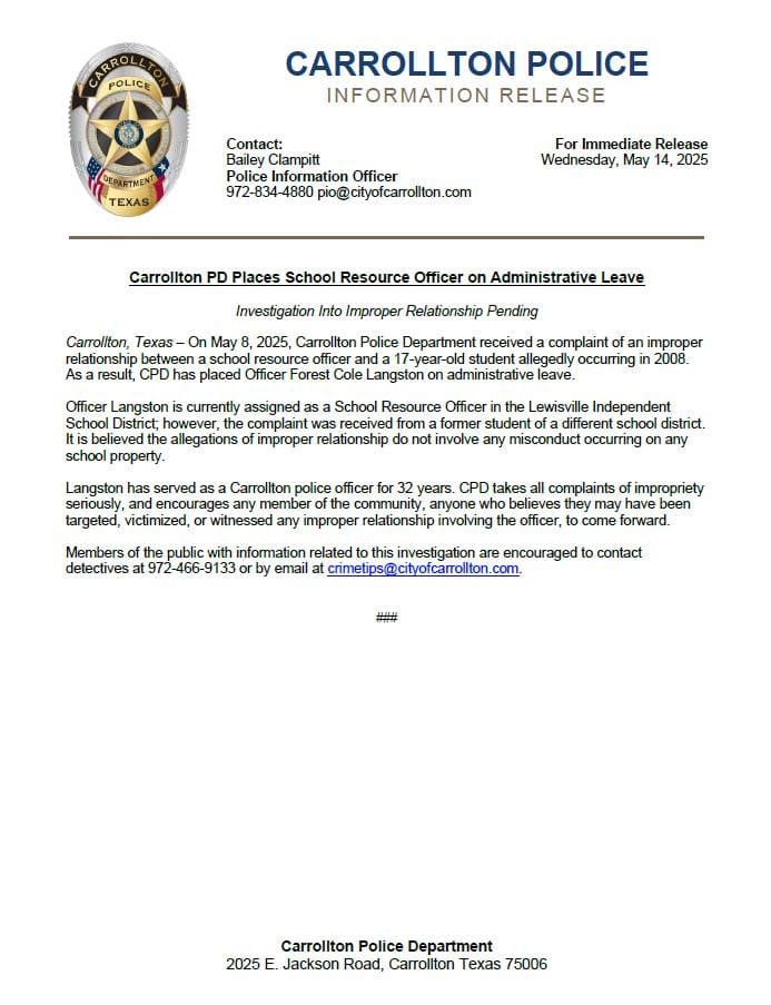 The officer is not currently listed on Lewisville ISD’s roster of School Resource Officers. School social media posts indicate Langston has worked at district schools for at least 10 years.