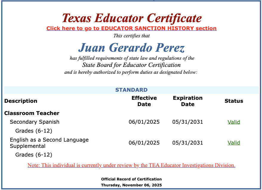 Perez has been certified to teach Spanish and English as a Second Language since 2001. His current teaching certificate is under review by the Texas Education Agency.