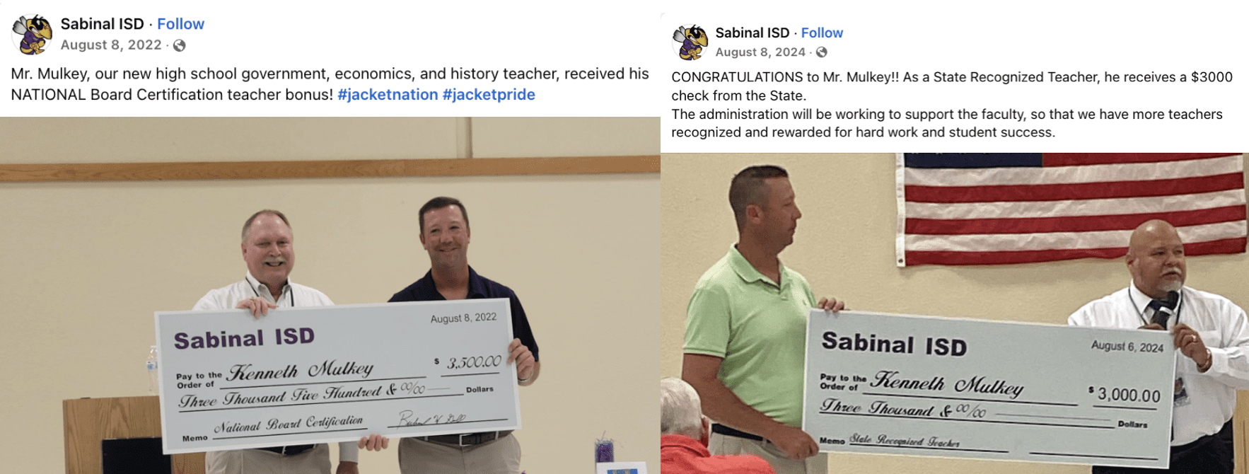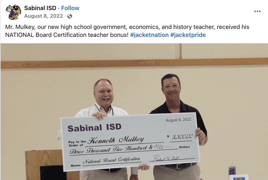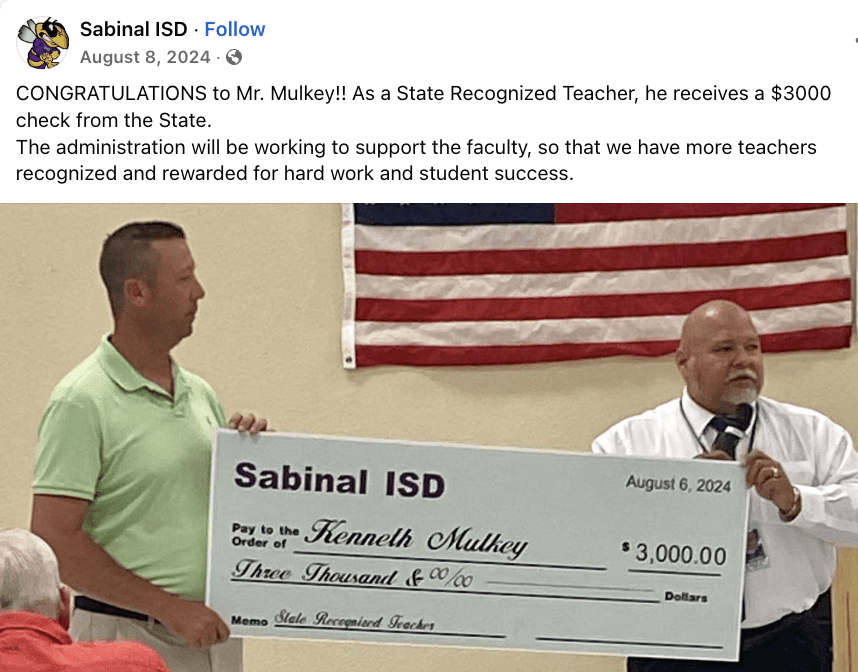 In August 2024, he received a $3,000 check from the state for becoming a “Recognized” teacher through the Teacher Incentive Allotment program.
