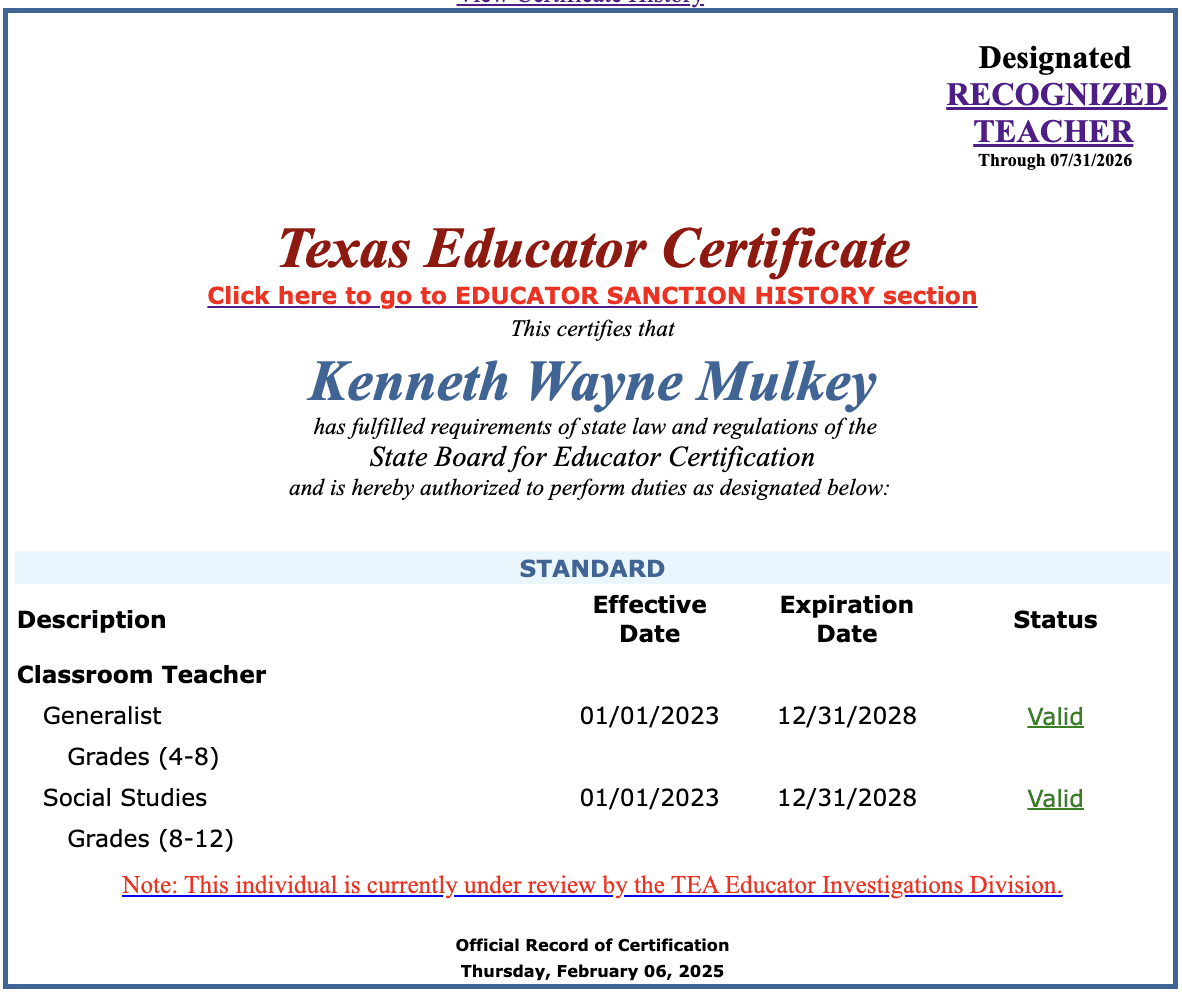 State records show Mulkey has been certified to teach in Texas since 2004. His current teaching certificate is under review by the Texas Education Agency.