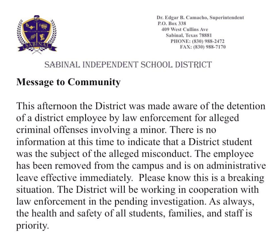 Sabinal ISD Superintendent Edgar Camacho released a statement that day advising the community that a district employee had been placed on administrative leave “effective immediately” following the employee’s “detention by law enforcement” for alleged criminal offenses involving a minor.