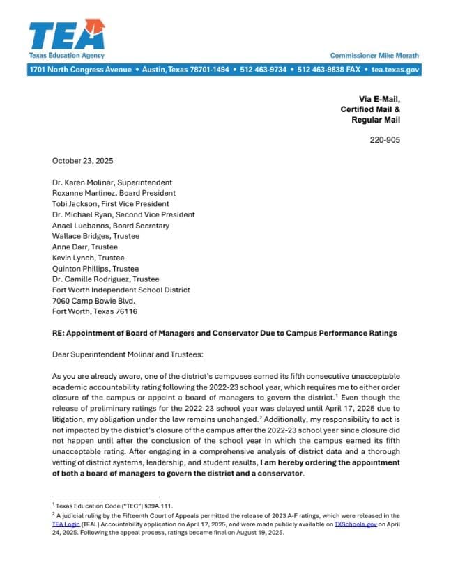 Following the announcement, school board members from Fort Worth ISD requested that Morath reconsider the action, asserting that locally elected leadership are best positioned to support Fort Worth ISD’s progress.