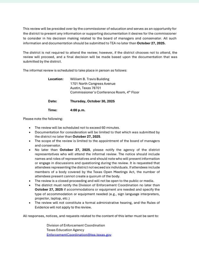 “Although the release of preliminary ratings for the 2022-23 school year was delayed until April 17, 2025 due to litigation, my obligation under the law remains unchanged,” TEA Commissioner Mike Morath told the district.