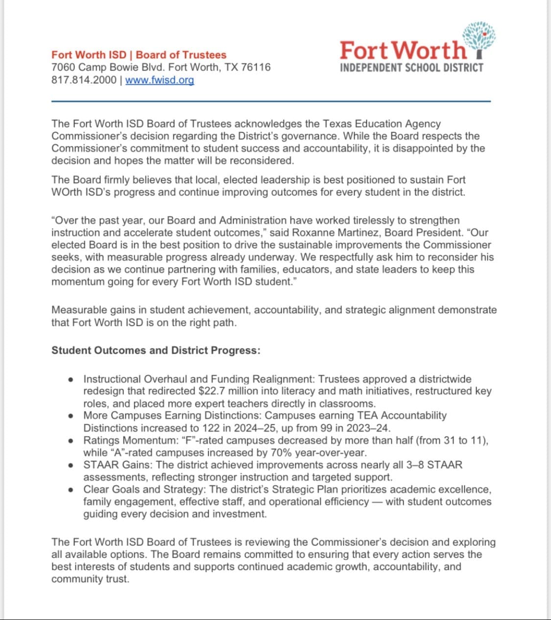 “Over the past year, our Board and Administration have worked tirelessly to strengthen instruction and accelerate student outcomes,” said Roxanne Martinez, Fort Worth ISD board president. “Our elected Board is in the best position to drive the sustainable improvements the Commissioner seeks, with measurable progress already underway.”
