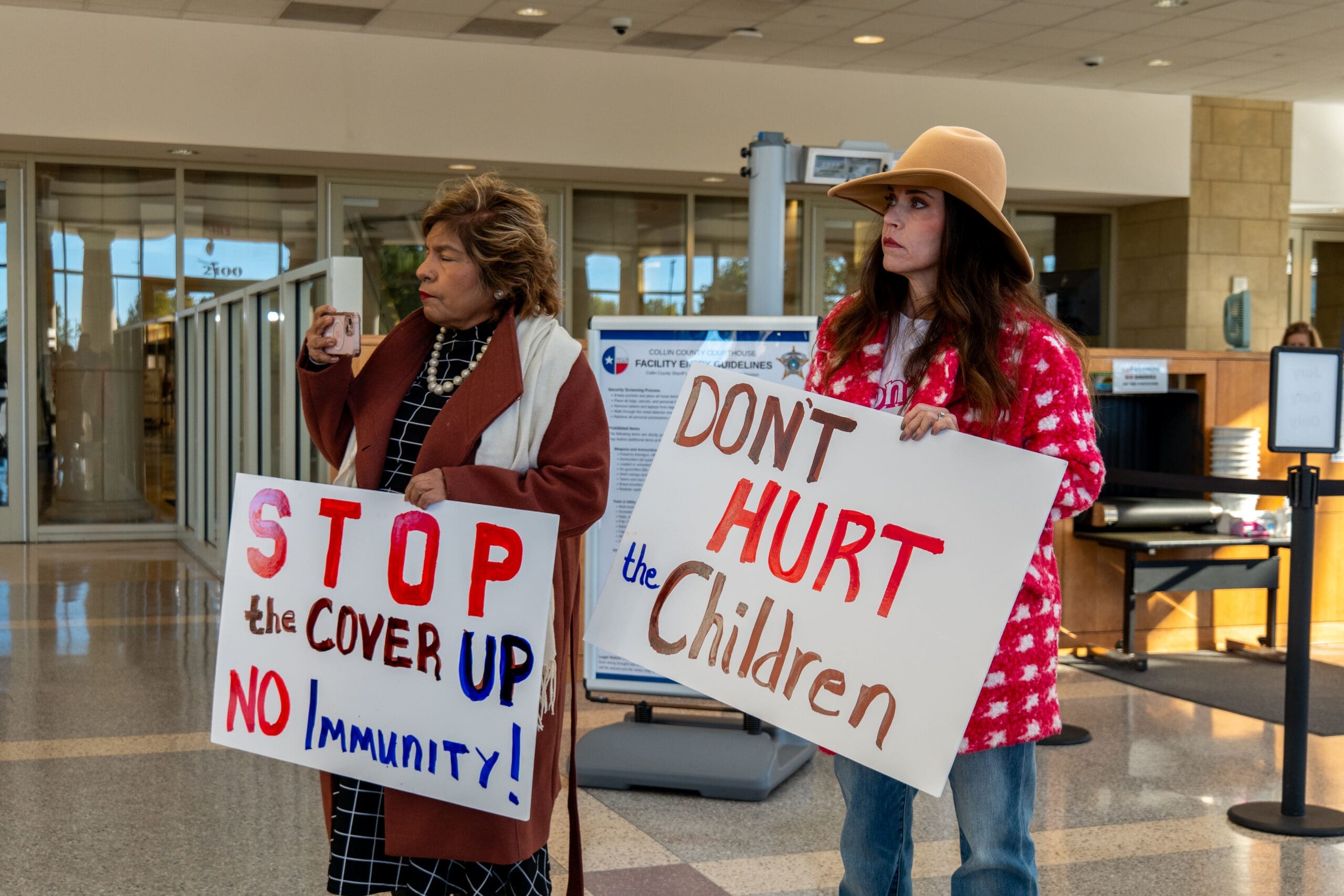 There were child protection advocates in attendance displaying signs with slogans such as “Don’t hurt the children” and “Stop the cover up.”