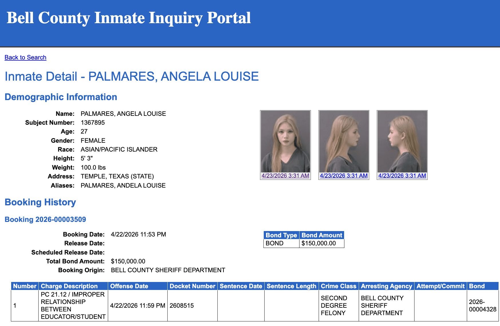 Angela Louise Palmares, 27, was arrested in Temple and charged with improper relationship between educator and student, a second-degree felony.